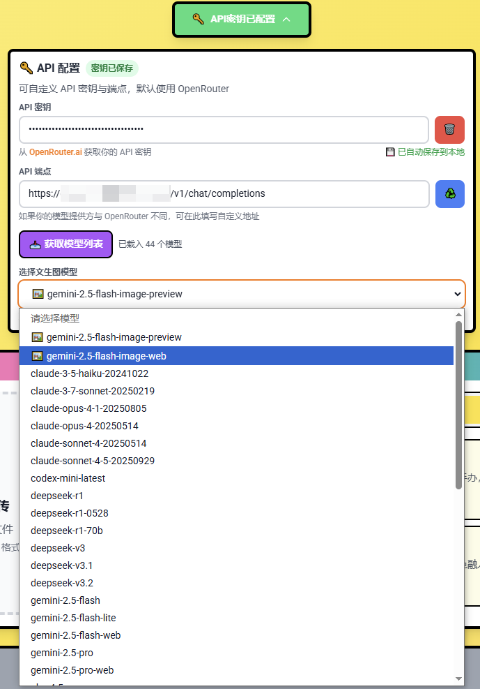 本项目的操作流程极其简单直观: 1. 填写 API 密钥 2. 设置 API 端点 3. 刷新模型列表并选择所需的绘图模型 4. 开始爽玩