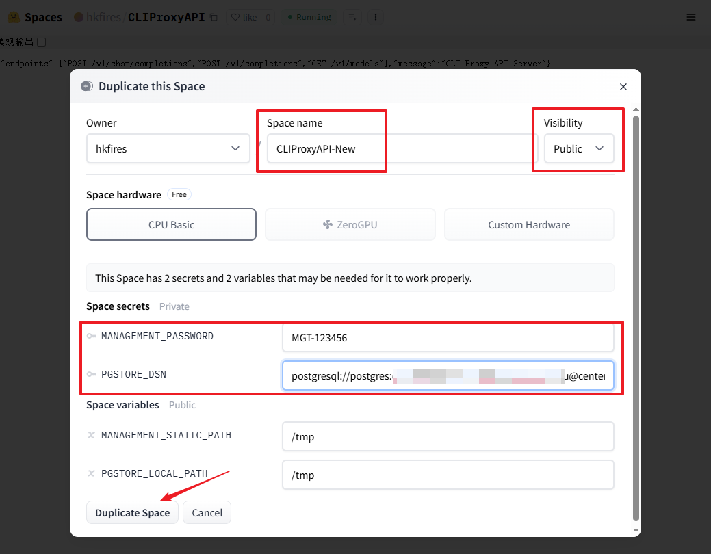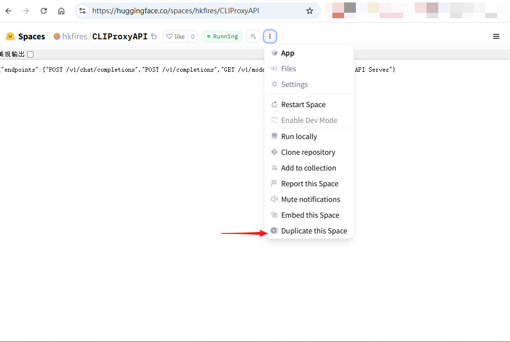 首先,请访问我预先建立好的 CLIProxyAPI 项目模板,然后如下图所示,点击下拉菜单中的 Duplicate this Space 来复制项目