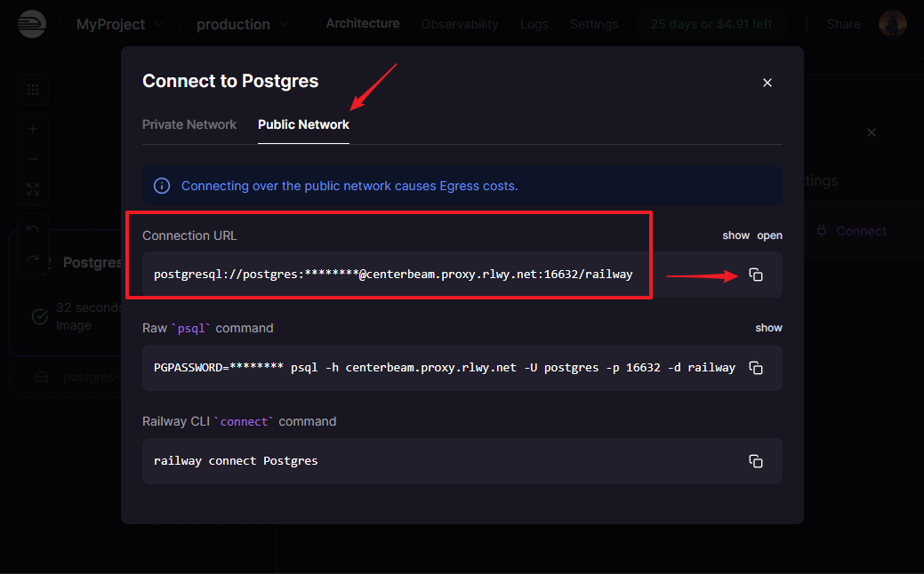 请复制并保存 Public Network 选项卡下的 Connection URL,后续步骤将会用到