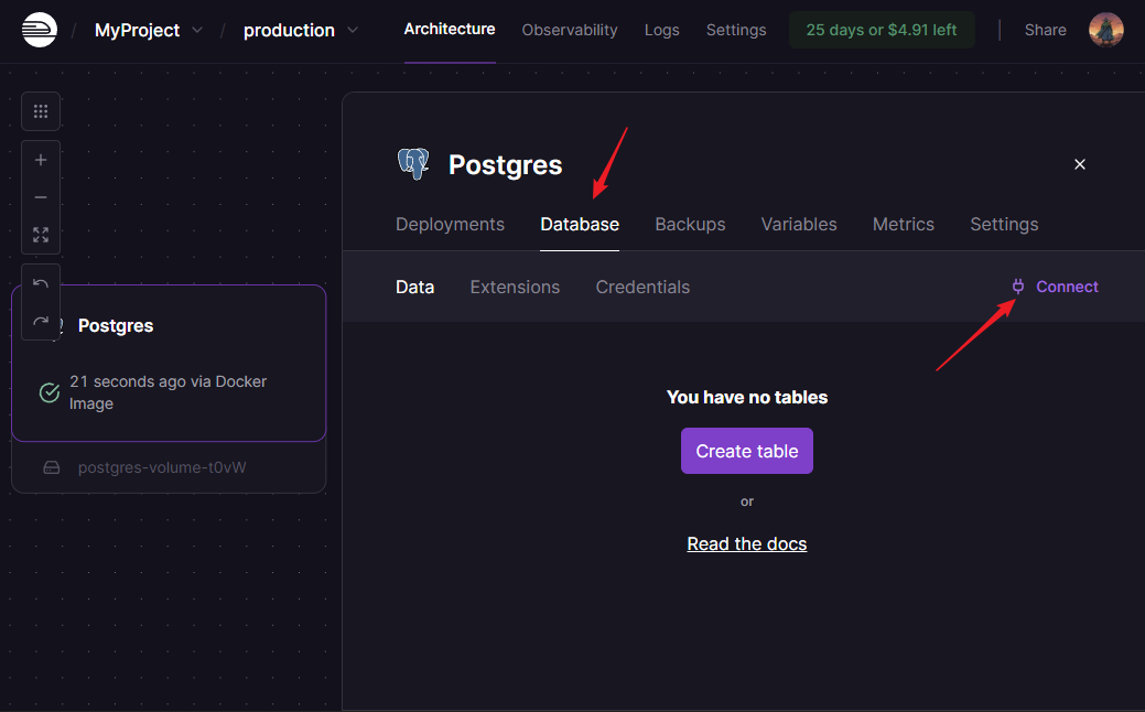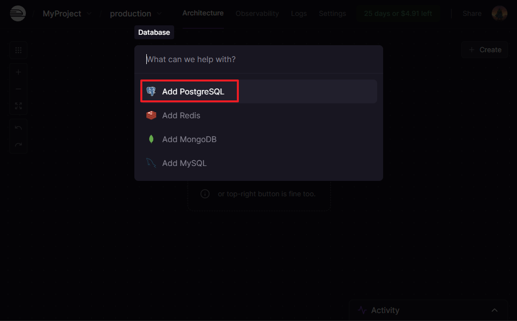 首先,登录你的 Railway 账号,在工作空间中创建一个新实例,选择 Database -> Add PostgreSQL