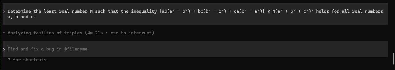 这是一道能让 GPT-5 陷入长久思考的数学题,在 GPT-5 出来不久的时候,把思考量设置为 High,这道题能够稳定触发 GPT-5 的150秒截断(当然现在官方已经修复了这个问题了,请求时长可以超过150秒了)