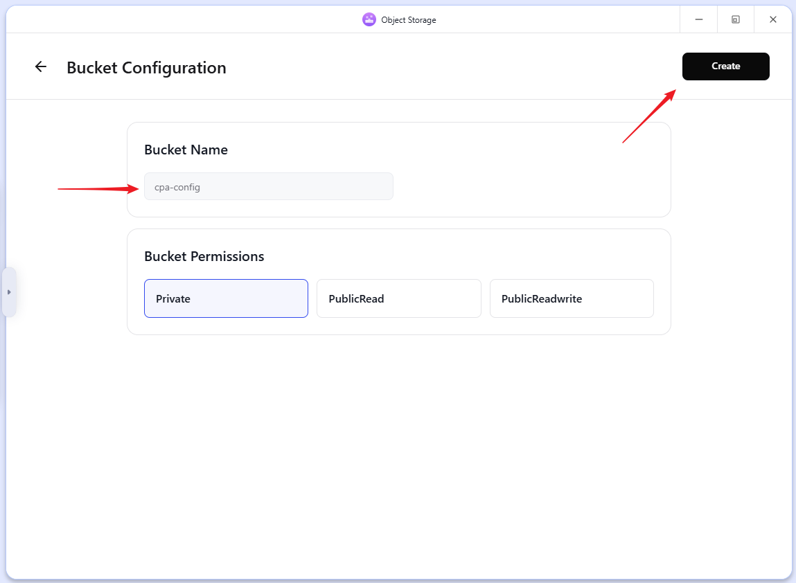 输入一个自定义的存储桶名称(名称要求小写),然后点击右上角的 Create