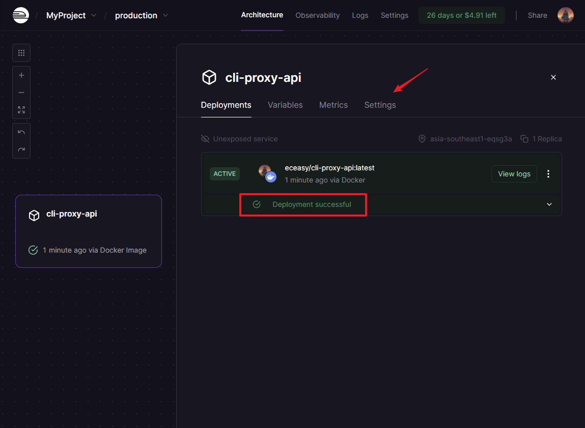等待部署完成(出现 “Deployment successful” 提示)后,点击进入 Settings 标签页