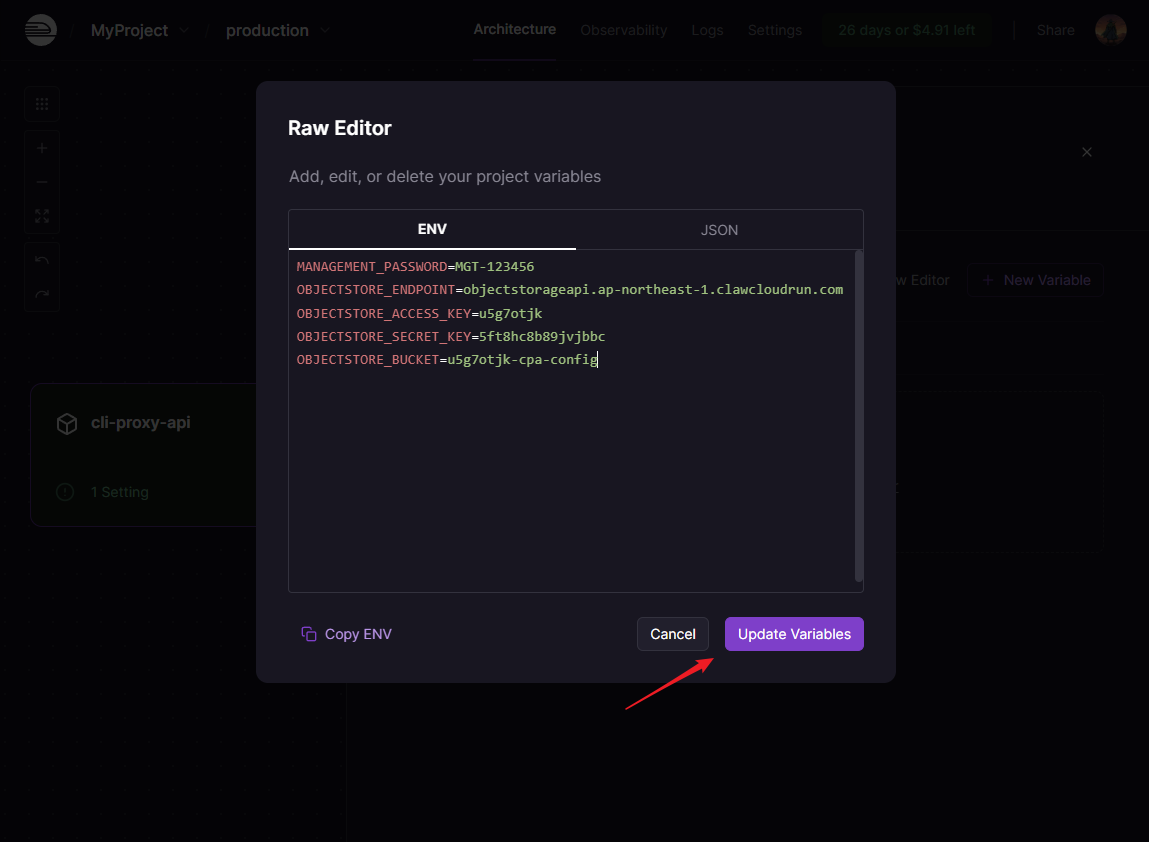 将我们先前准备好的环境变量粘贴进去,然后点击 Update Variables