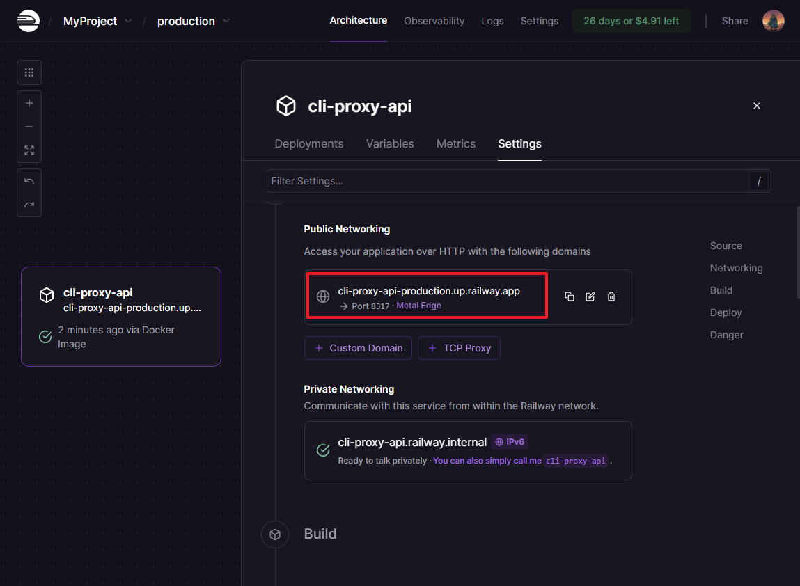 此时,Railway 会为你生成一个公开访问地址,通过该地址即可访问 CLIProxyAPI 的 WebUI 界面了,能够打开网页,就算部署成功了