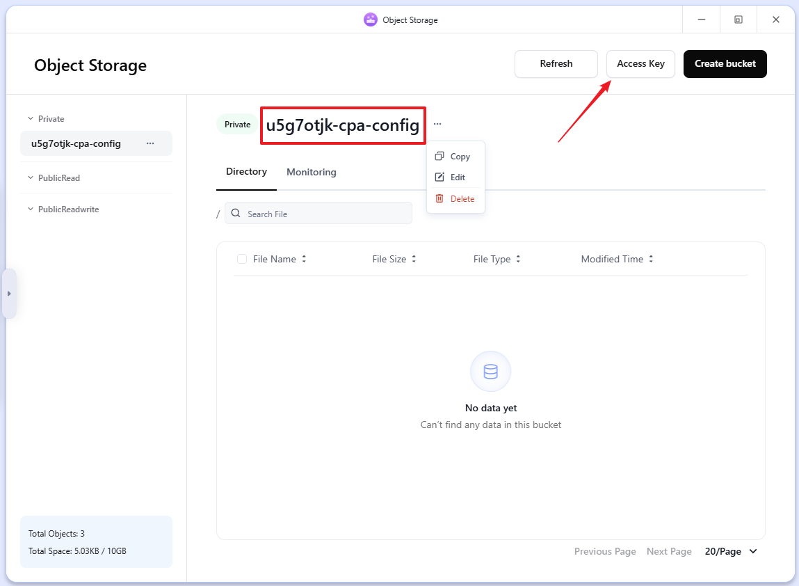 至此,存储桶便已创建完成。接下来,我们需要记录以下 4 个关键参数:存储桶全名(图中红框所示)、Access Key、Secret Key 以及 External 地址