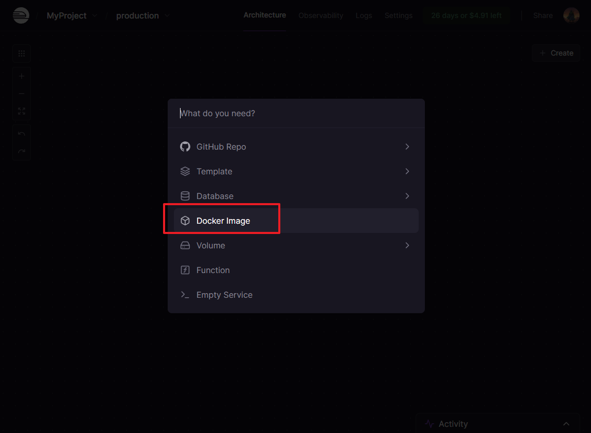 在 Railway 的项目仪表盘中,点击 Create,选择 Docker image