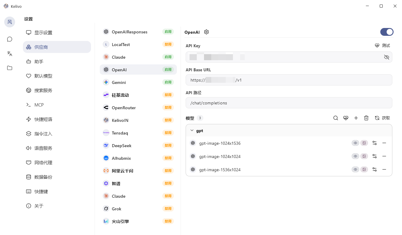 接下来,我们就以 Kelivo 客户端为例,看看具体的调用流程(这里不使用 Cherry Studio,主要是因为它内部将画图请求与固定模型名称做了强绑定,会导致我们的自定义模型无法被正确路由)。