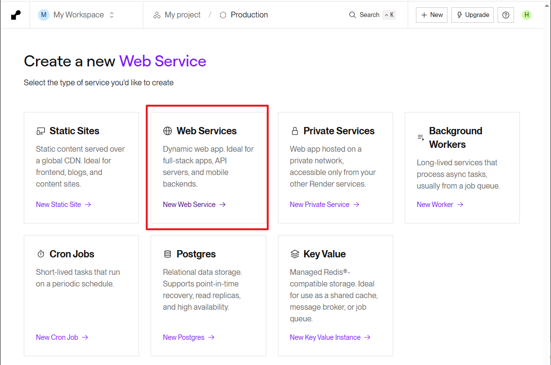 首先,请确保你已注册 Render 账户。登录后,新建项目并选择 New Web Service