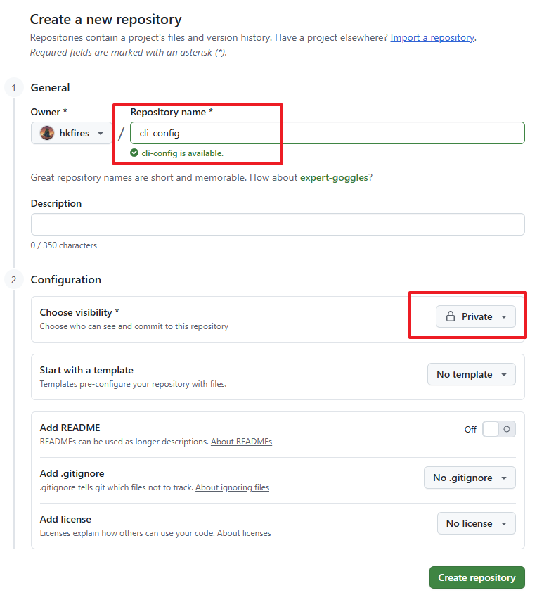 首先,我们需要在 GitHub 上创建一个空的仓库。仓库名称可自定义,但务必设为私有,否则你添加的 API Key 等敏感信息就会裸奔了