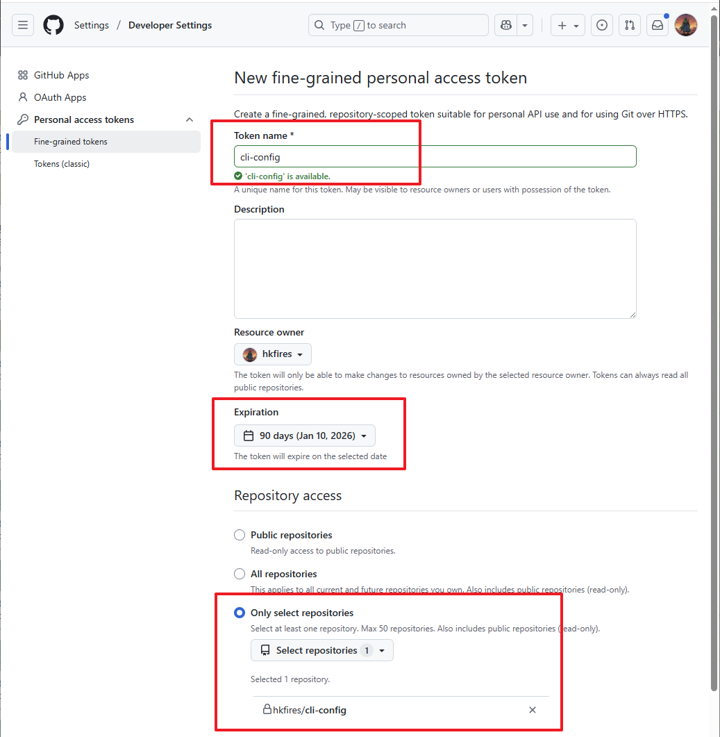 如图所示填写 Token name(可自定义),根据你的需求选择过期时间(Expiration),并在 Repository access 中选择 Only select repositories,然后选中我们刚刚创建的那个空白仓库