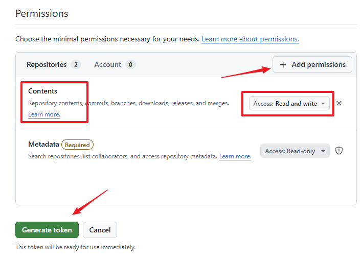 permissions 中找到 Contents,添加并将其权限从
