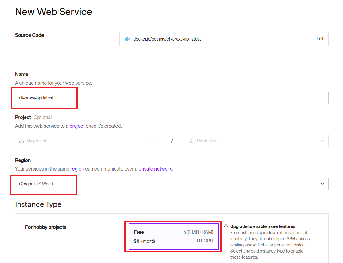 输入服务名称(Name,可自定义),选择区域(Region,可根据个人偏好选择),并确保实例类型为 Free