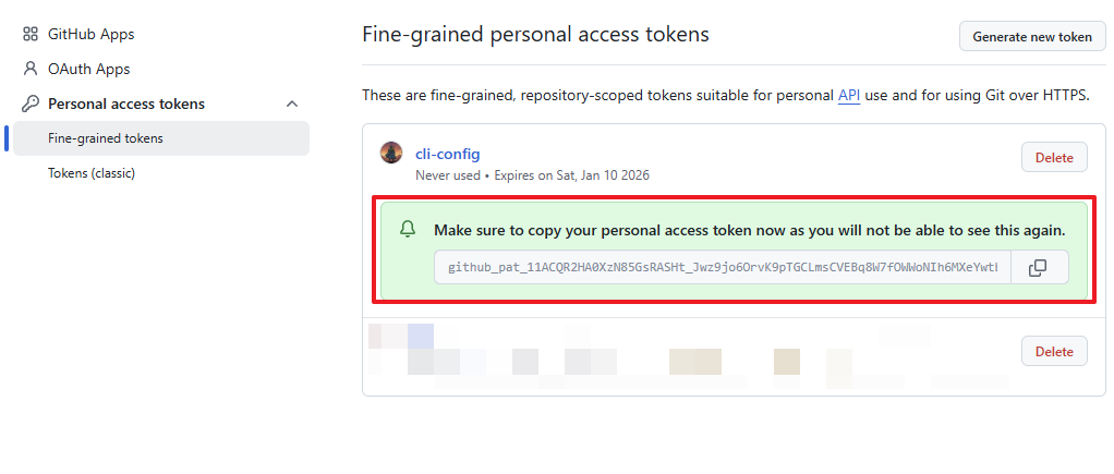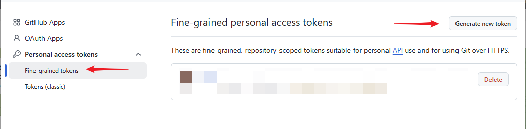 接着,依次点击 Personal access tokens -> Fine-grained tokens,然后点击右上角的 Generate new token