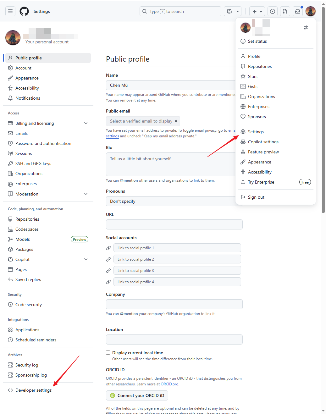 创建仓库后,记下仓库的 URL 地址。接下来我们点击页面右上角的个人头像,进入 Settings,然后点击左侧菜单最下方的 Developer Settings