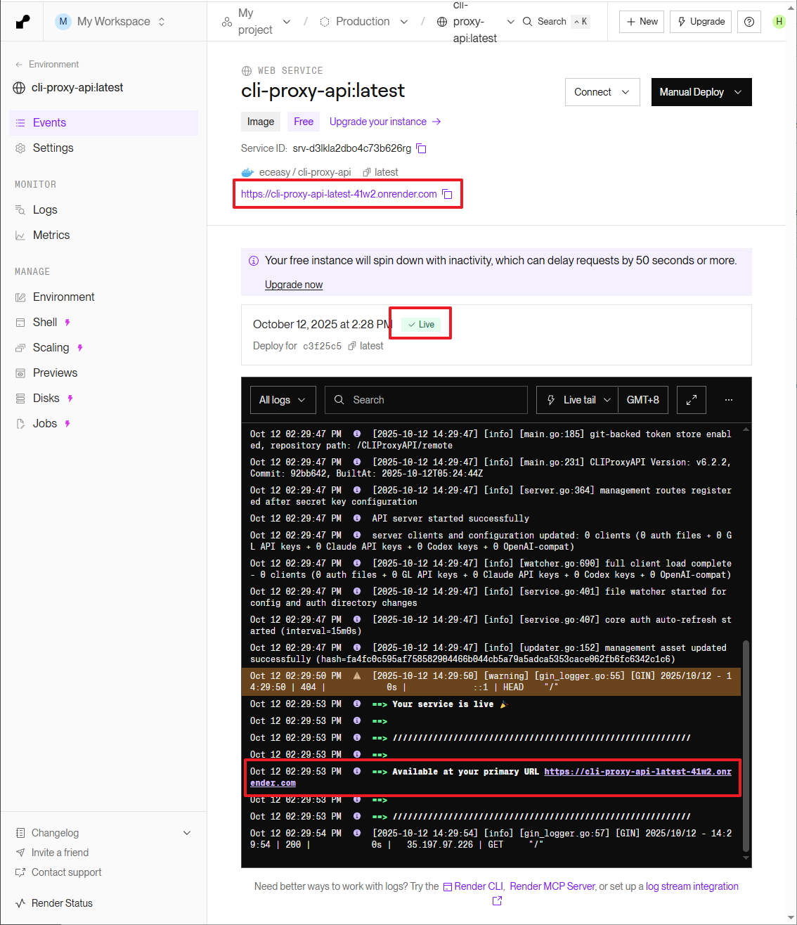 至此,在 Render 上部署 CLIProxyAPI 的全流程已完成。其他类似的容器云平台也可采用此方法进行部署,大家可自行探索。