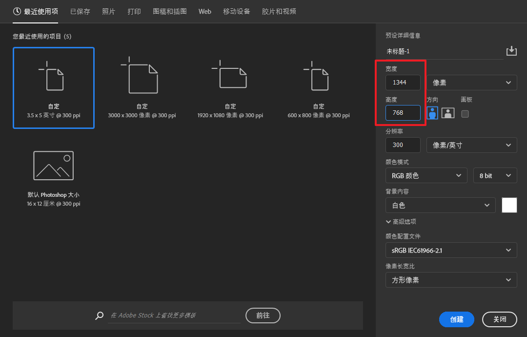 首先我们需要准备一张你想要的比例的空白图片,最好参照文章一开头的表格中的分辨率来生成,例如我在 PS 中输入如下的参数,生成一张 1344 x 768 大小的纯白图片,并以 PNG 格式导出