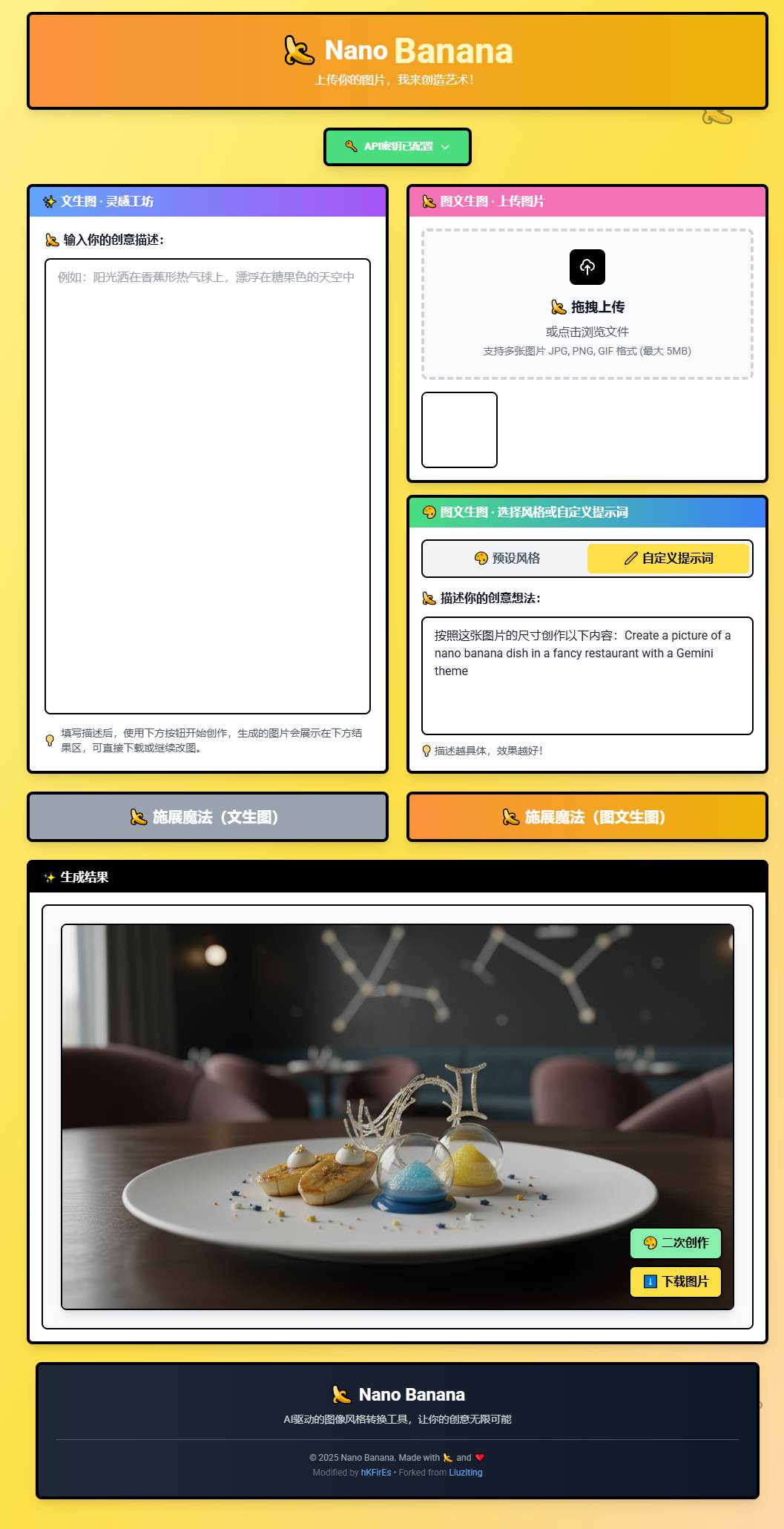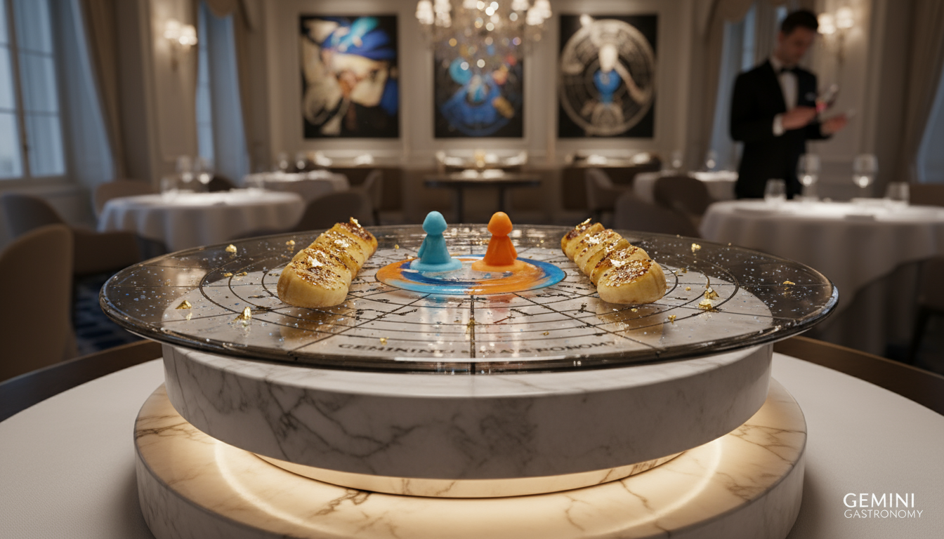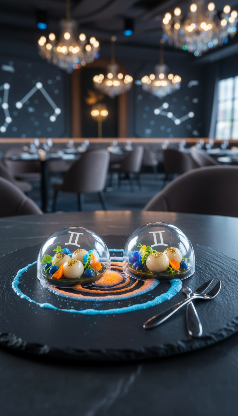 1 | 按照这张图片的尺寸创作以下内容:Create a picture of a nano banana dish in a fancy restaurant with a Gemini theme |
